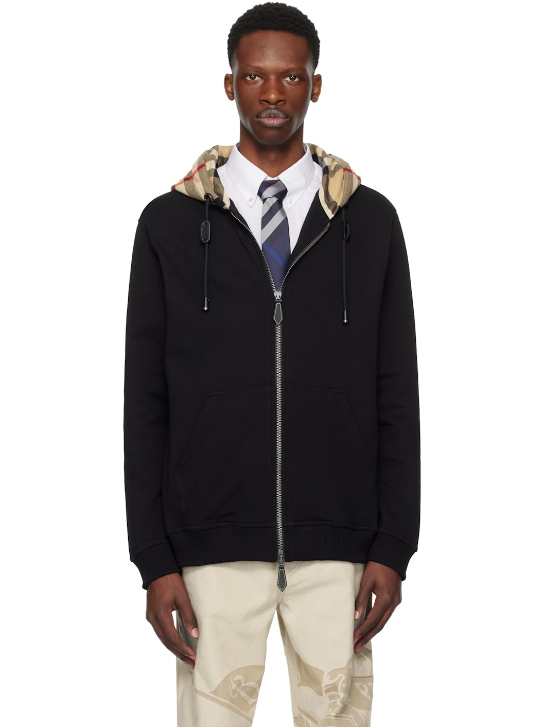 French terry hoodie. · Check pattern and cord-lock drawstring at hood · Zip closure · Patch pockets · Rib-knit hem and cuffs Supplier color: Black/Archive beige Body: 100% cotton. Trim: 98% cotton, 2% elastane. Made in Portugal 252376M202006