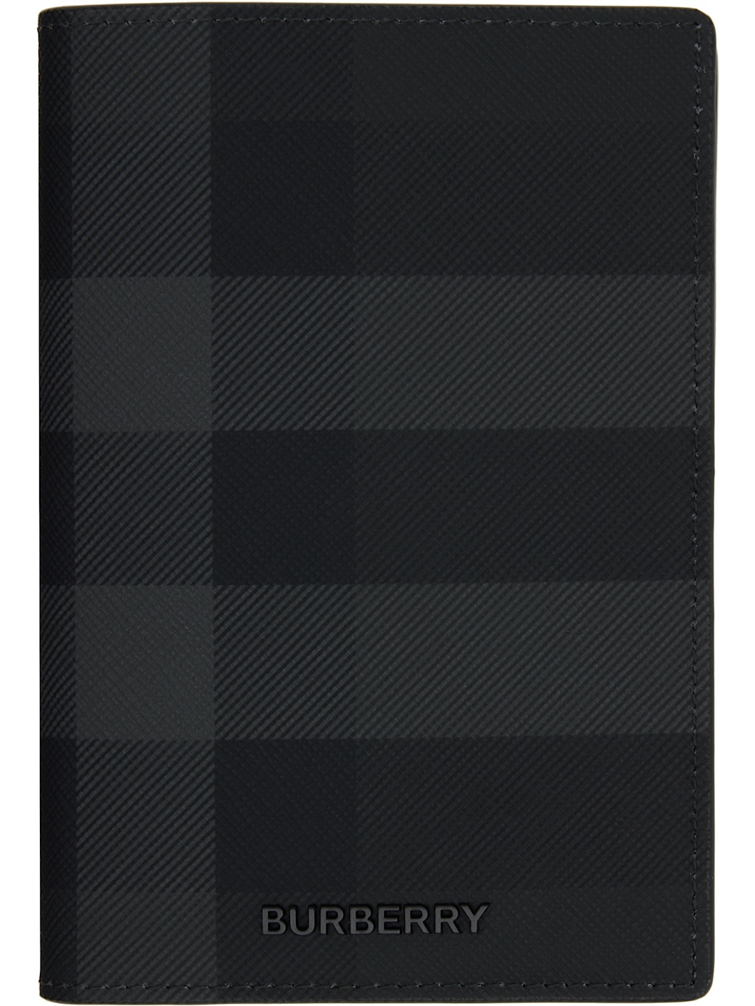 Coated canvas passport holder in black. · Check pattern and hand-painted edges throughout · Logo hardware at face · Three card slots at interior · Two patch pockets · One passport slot · Buffed calfskin and twill lining · H5.5" x W3.75" x D0.75" Supplier color: Charcoal Body: 7% thermoplastic polyurethane, 30% cotton. Lining 1: 100% calfskin. Lining 2: 100% polyamide. Made in Moldova 252376M162000