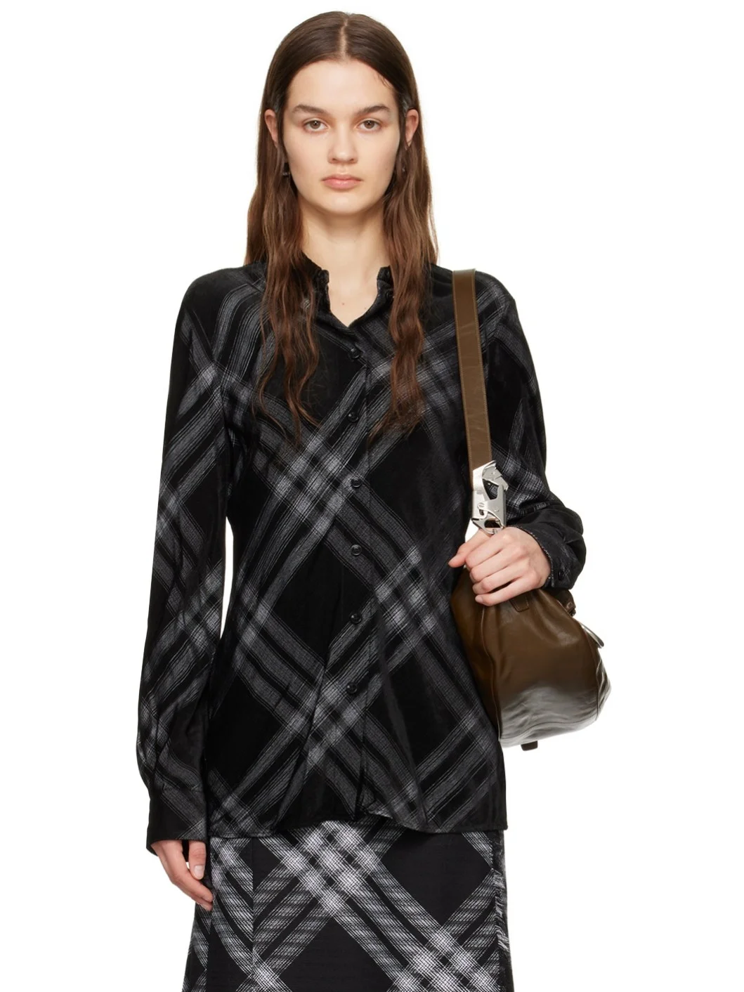 Viscose velvet shirt. Check pattern throughout. · Twill spread collar · Button closure · Shirttail hem · Single-button barrel cuffs Supplier color: Monochrome ip pttn 100% viscose. Made in Italy 241376F109012