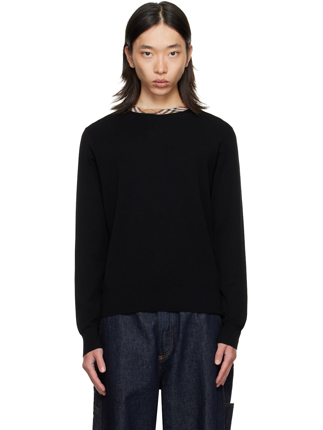 Knit wool sweater. · Rib-knit crewneck, hem, and cuffs · Check pattern at collar Supplier color: Black Body: 100% wool. Trim: 98% wool, 1% polyamide, 1% elastane. Made in Romania 252376M201006