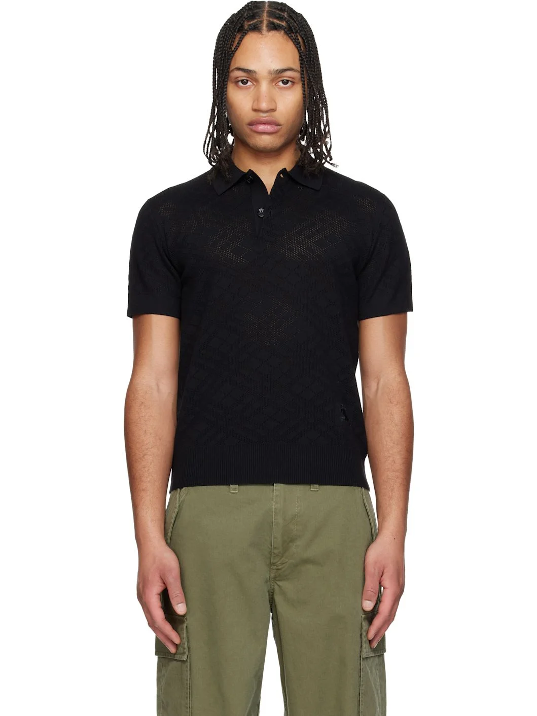 Knit wool polo. · Open-knit check pattern throughout · Rib-knit spread collar, hem, and cuffs · Two-button placket · Logo embroidered at front · Buffalo horn hardware Supplier color: Black Body: 100% wool. Trim: 95% wool, 4% nylon, 1% elastane. Made in Italy 261376M212016