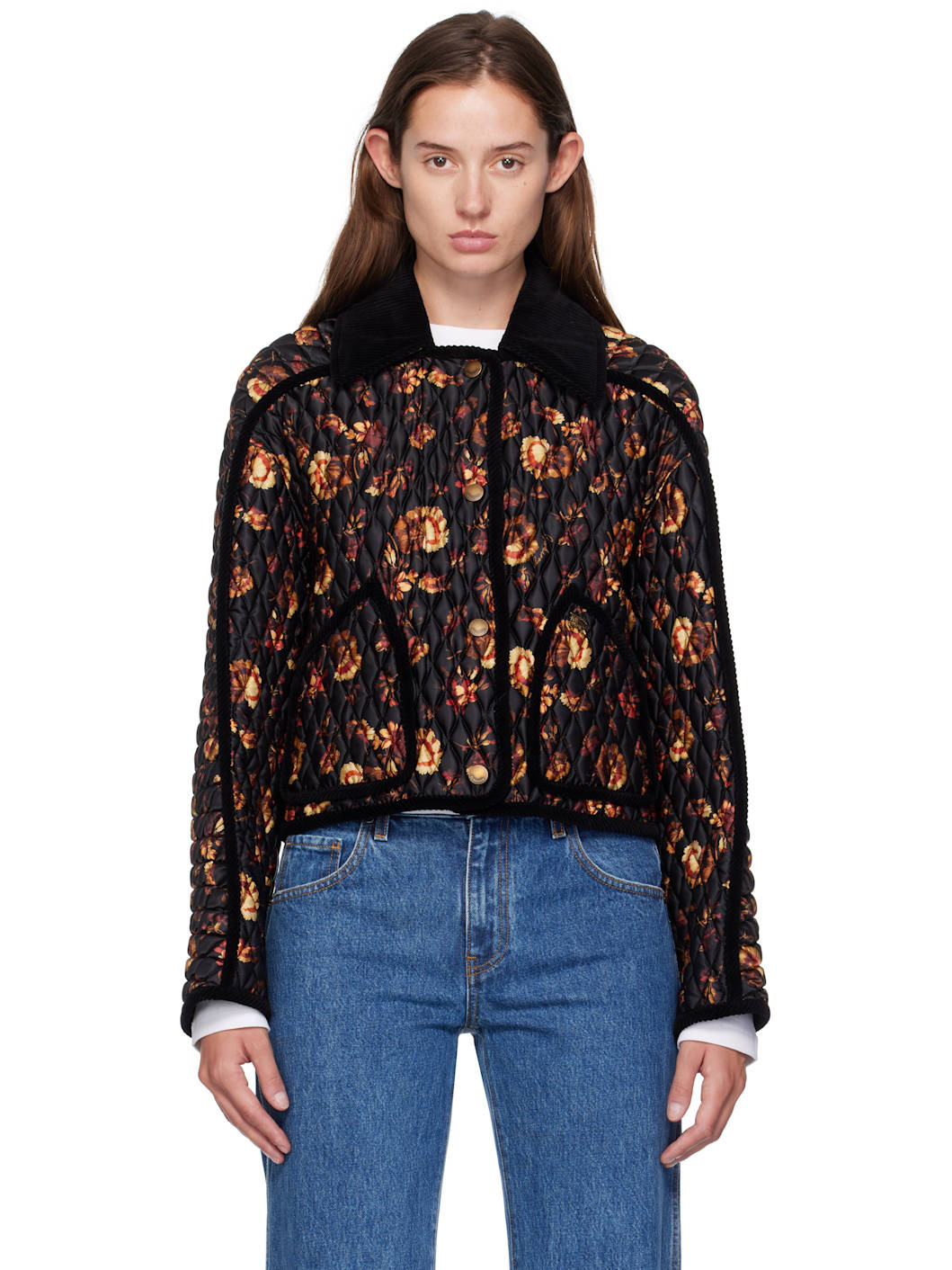 Quilted nylon satin jacket. · Floral logo pattern throughout · Corduroy trim throughout · Spread collar · Press-stud closure · Patch pockets at waist · Logo hardware at front waist pocket · Cropped hem · Quilted lining Supplier color: Crimson Red IP pattern Body: 100% nylon. Trim: 100% cotton. Made in Italy 252376F063019