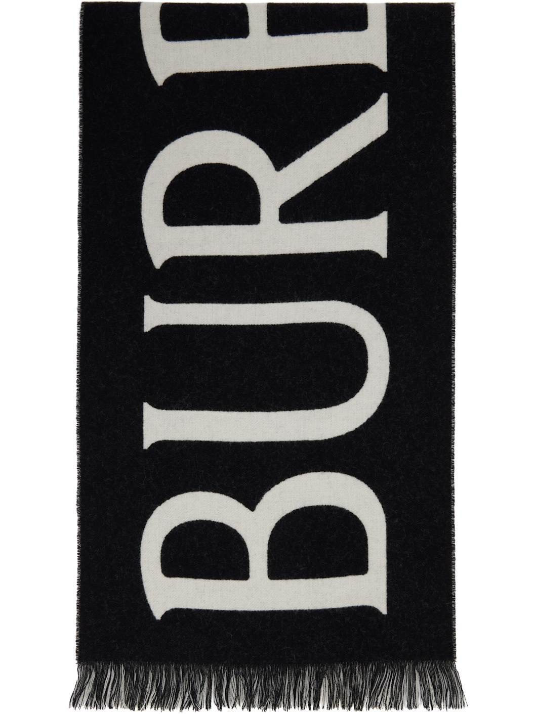Brushed wool twill scarf in black and gray. · Jacquard logo at front and back · Fringed detailing at ends · L76" x W13" Supplier color: Black/Calico 100% wool. Made in Italy 252376M150006
