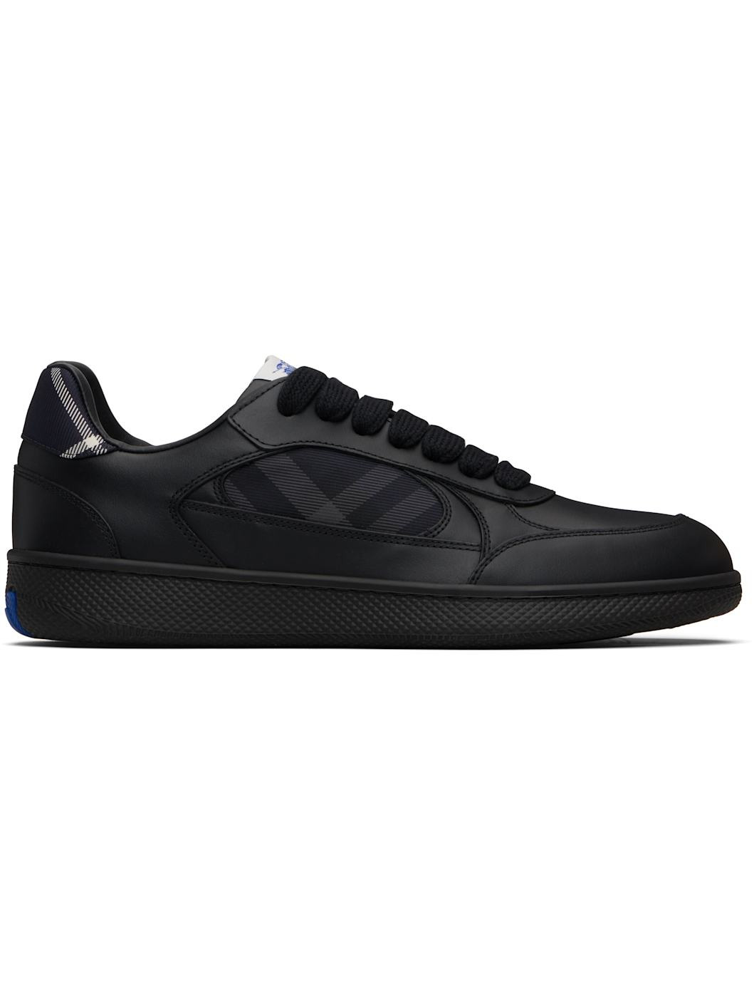 Low-top buffed calfskin and twill sneakers. · Signature check pattern throughout · Lace-up closure · Logo patch at padded tongue · Padded collar · Textured rubber midsole · Treaded rubber sole Supplier color: Black/Storm blue check Upper: calfskin, textile. Sole: rubber. Made in Italy 252376M237018