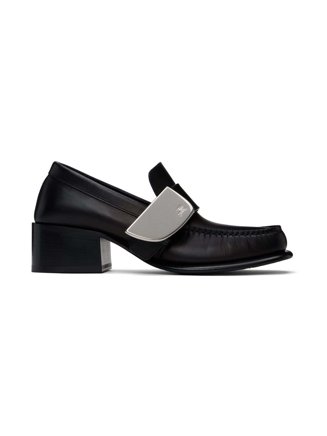 Buffed leather loafers in black. · Square moc toe · Logo plaque at vamp · Logo embossed at quilted leather footbed · Buffed leather and suede lining · Stacked leather block heel with rubber injection · Leather sole with rubber injection · Heel: H2" Supplier color: Black Upper: leather. Sole: leather, rubber. Made in Italy 242376F121000
