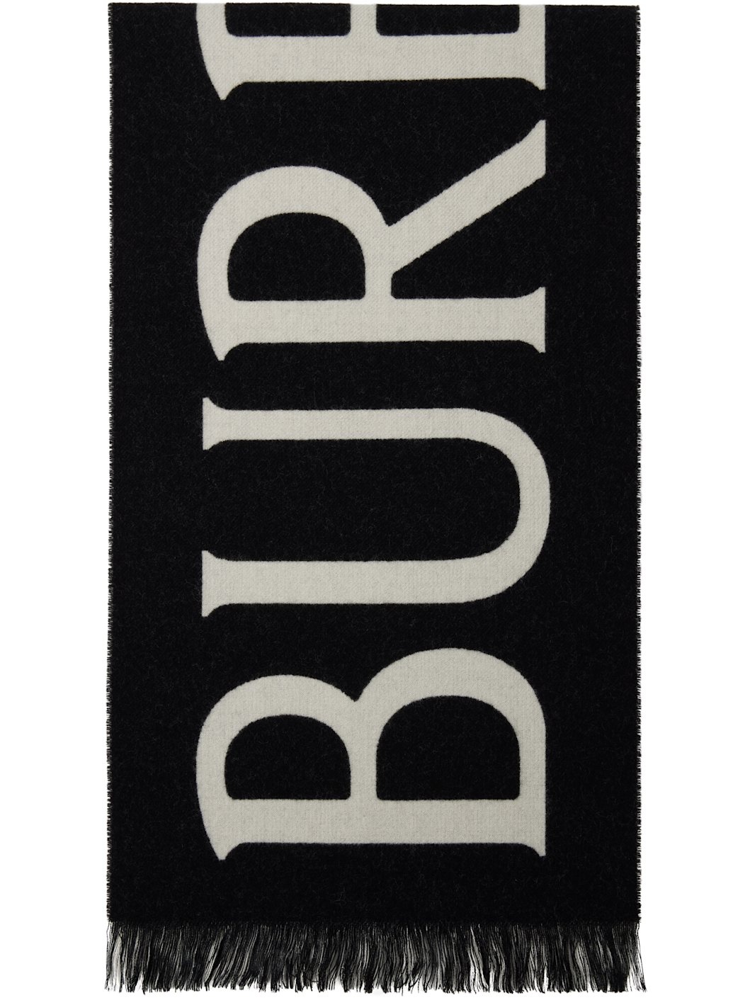 Rectangular knit wool scarf in black and off-white. · Jacquard logo at face and back face · Fringed detailing at ends · Logo patch at end · L67" x W13" Supplier color: Black/Calico 100% wool. Made in Italy 252376F028056