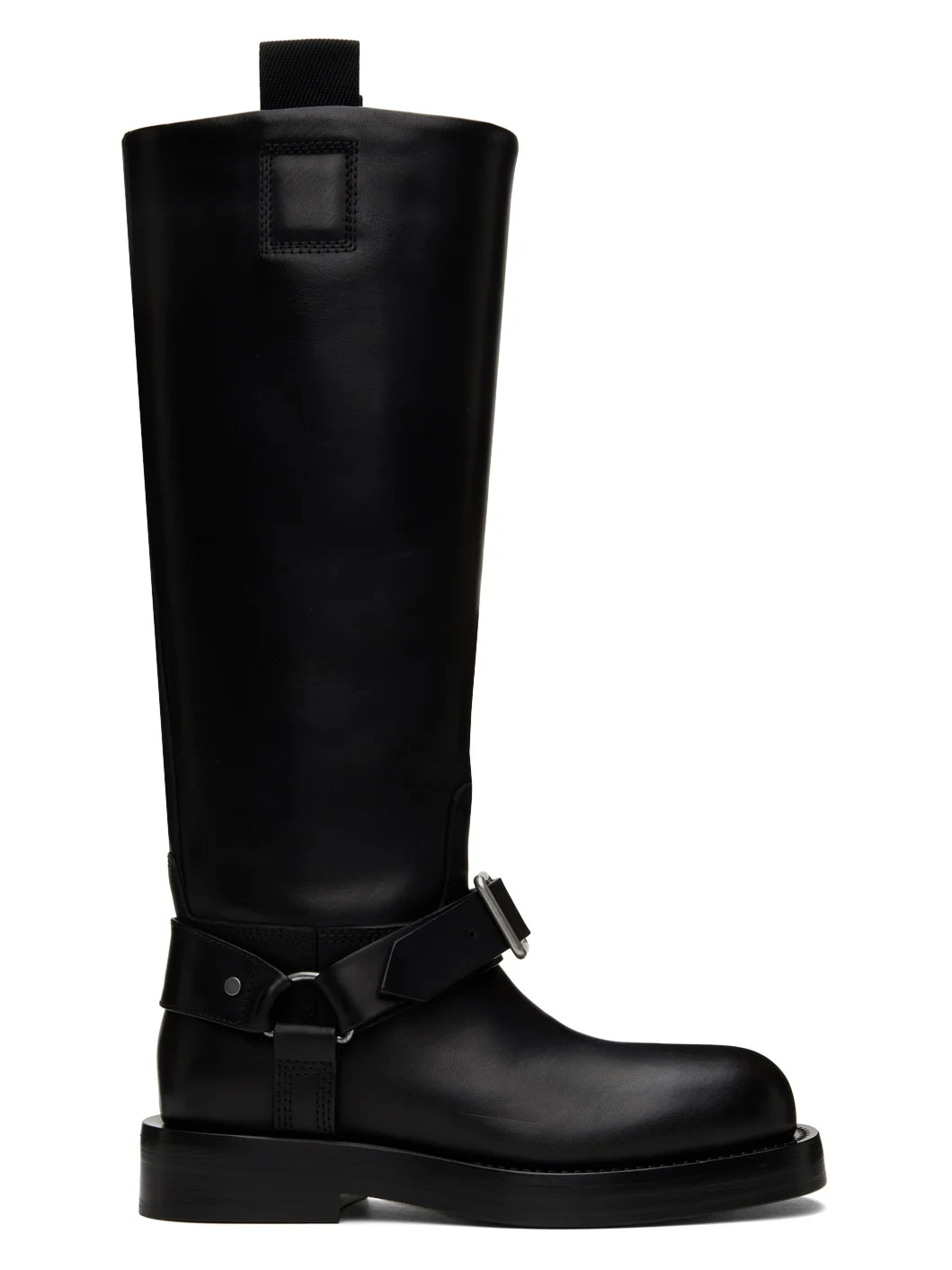 Mid-calf buffed calfskin slip-on boots in black. · Webbing pull loops at collar · Pin-buckle harness at ankle · Leather block heel with rubber injection · Leather sole Supplier color: Black