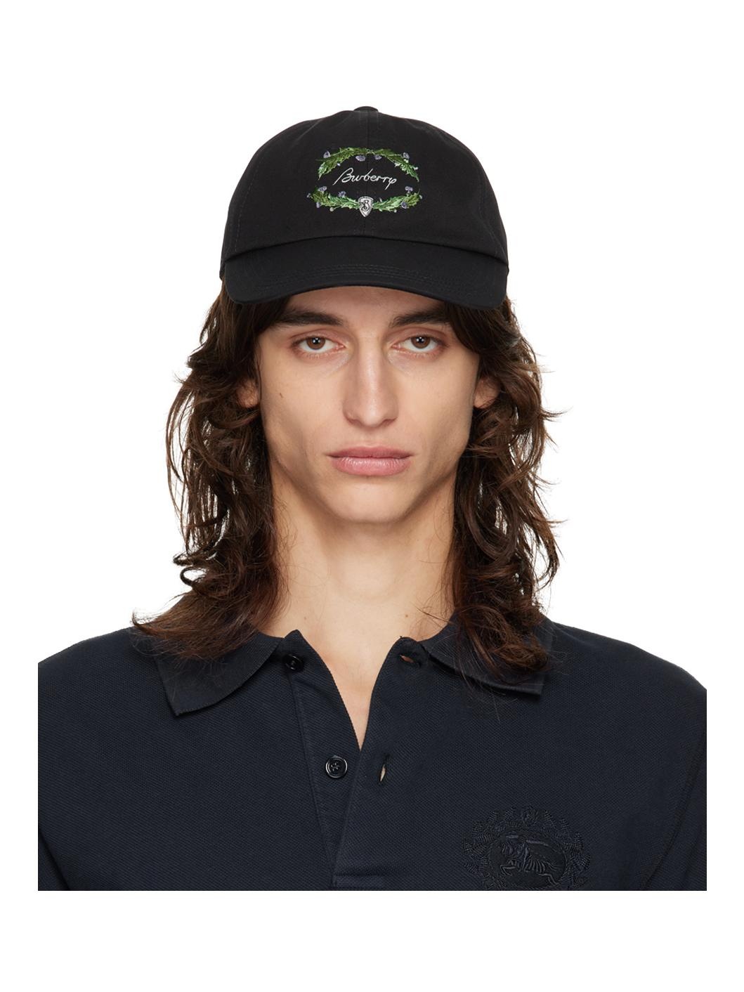 Cotton-blend twill cap in black. · Embroidered eyelets at crown · Logo graphic embroidered at face · Curved brim · Pin-buckle fastening · Cotton poplin lining Supplier color: Coal Body: 66% polyester, 34% cotton. Lining: 100% cotton. Made in Italy 242376M139013