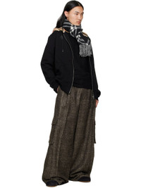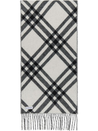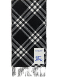 Rectangular cashmere flannel scarf. · Check pattern throughout · Logo patch at face · Fringed detailing at ends · L64" x W12 Supplier color: Black 100% cashmere. Made in United Kingdom 252376M150003