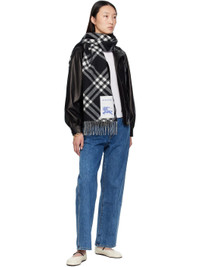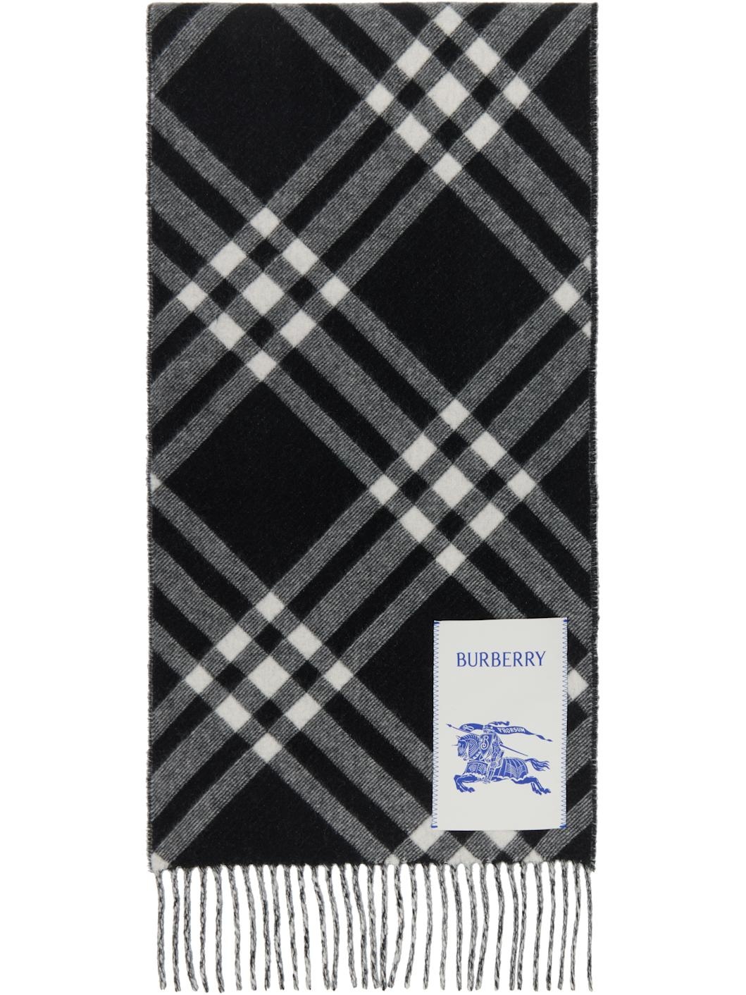 Rectangular cashmere flannel scarf. · Check pattern throughout · Logo patch at face · Fringed detailing at ends · L64" x W12 Supplier color: Black 100% cashmere. Made in United Kingdom 252376F028035