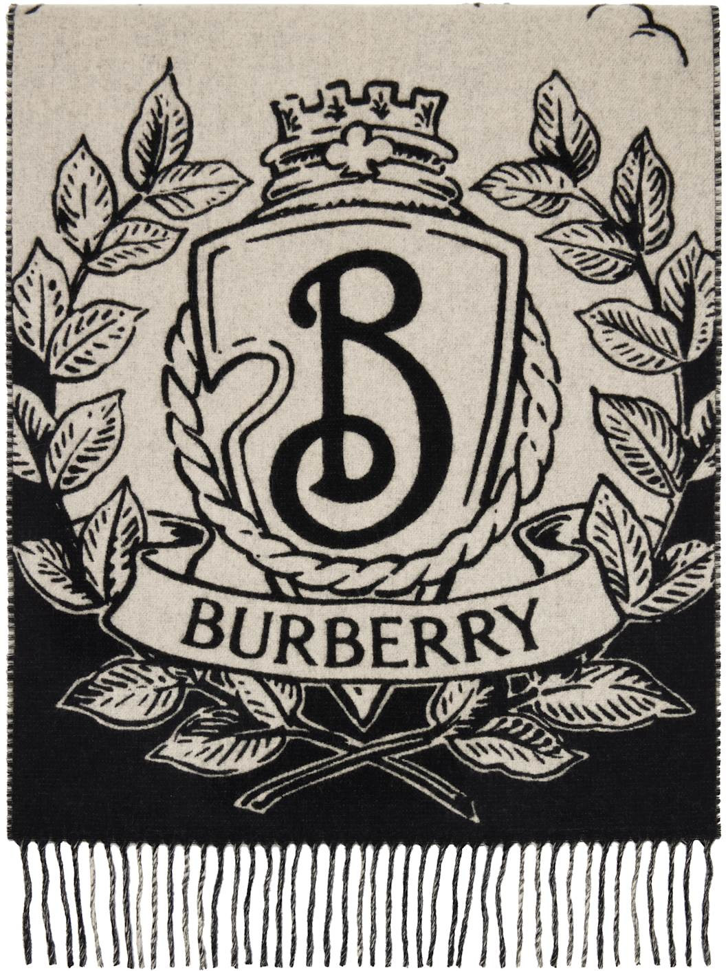 Rectangular cashmere flannel scarf. · Jacquard logo graphic at face · Fringed detailing at ends · Check pattern at back face · L82.5" x W19.5" Supplier color: Black/Calico 100% cashmere. Made in Italy 252376F028008