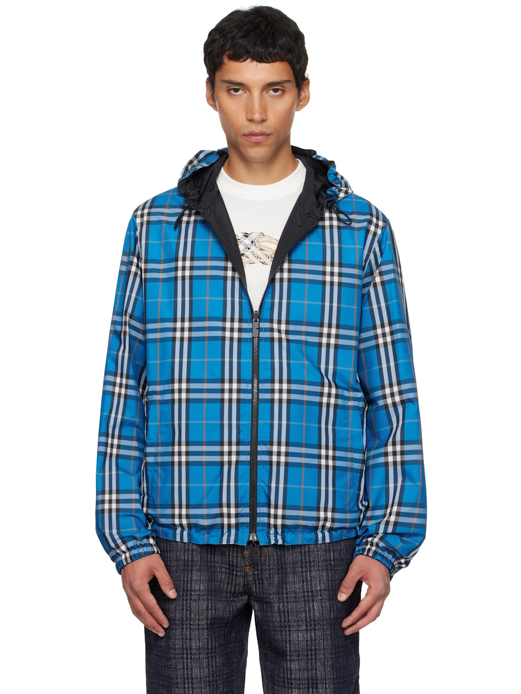 Reversible taffeta jacket. Reverse in navy nylon taffeta. · Check pattern printed throughout · Bungee-style drawstring at hood and hem · Two-way zip closure · Zip pockets at waist Supplier color: Hyacinth IP check Body: 100% polyester. Lining: 100% polyamide. Made in Thailand 252376M180013