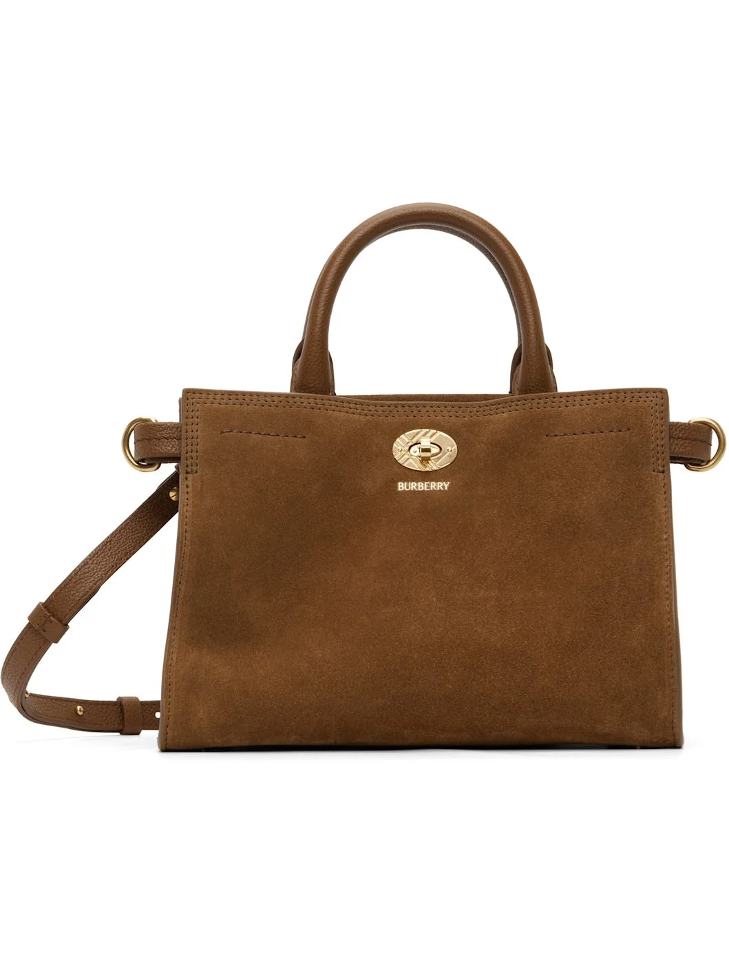 Calfskin suede tote. · Hand-painted edges throughout · Buffed calfskin rolled carry handles · Adjustable and detachable crossbody strap · Logo embossed at face · Cinch tab at sides · Twist-lock closure · Zip pocket at interior · Suede and textile lining · H7" x W9.5" x D5" Supplier color: Hazel Brown Calfskin. Made in Italy 261376F046000