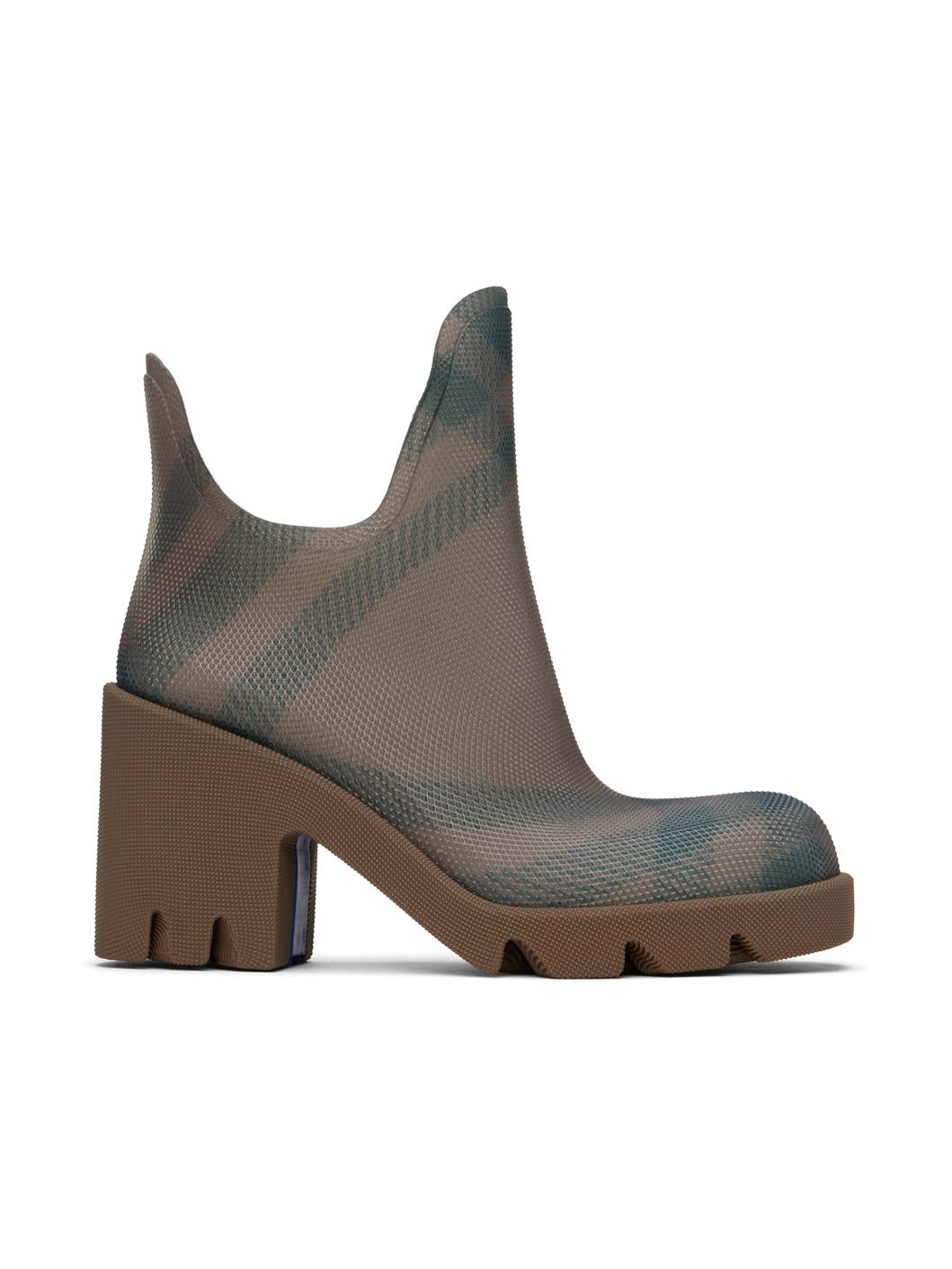 Ankle-high textured rubber boots in brown. · Check pattern throughout · Square toe · Jersey lining · Textured rubber block heel · Logo-embossed treaded TPU sole · Heel: H3.25" Supplier color: Linden Upper: rubber. Sole: rubber. Made in Italy 242376F113008