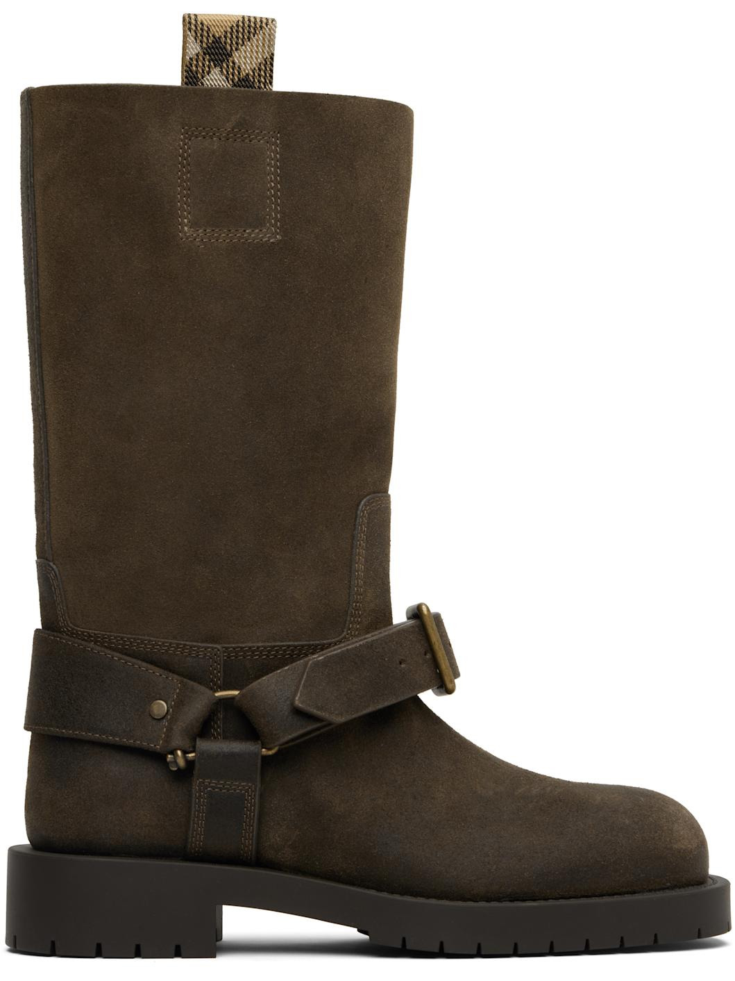 Calf-high calfskin suede boots. · Square toe · Pin-buckle strap at vamp · Signature check pattern pull-loops at collar · Treaded rubber sole Supplier color: Loch Upper: calfskin. Sole: rubber. Made in Italy 252376F115000
