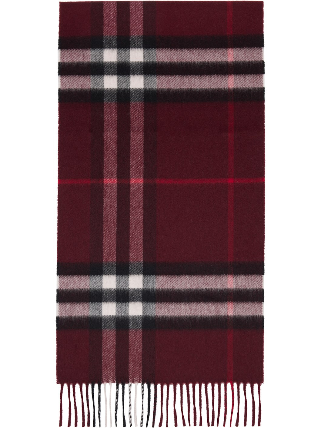 Rectangular brushed cashmere flannel scarf. · Check pattern throughout · Fringed ends · L72" x W12.75" Supplier color: Oxblood red 100% cashmere. Made in United Kingdom 252376M150018