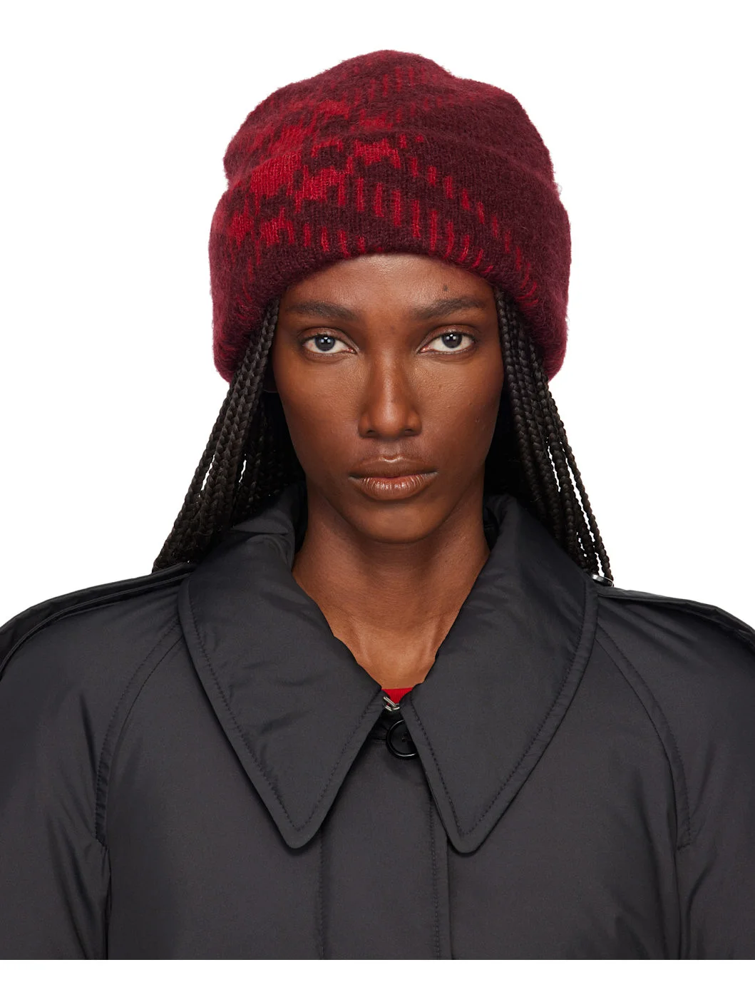 Brushed knit mohair-blend beanie. · Jacquard check pattern throughout · Rib-knit trim at rolled brim Supplier color: Oxblood red 51% mohair, 37% polyamide, 12% wool. Made in United Kingdom 261376F014003