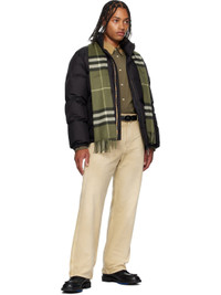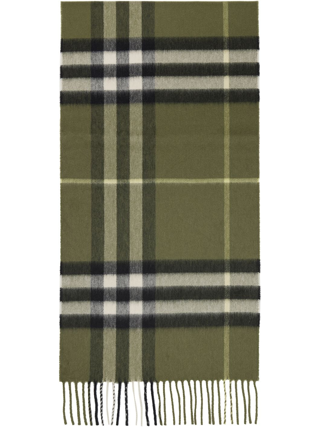 Rectangular brushed cashmere flannel scarf. · Check pattern throughout · Fringed ends · L72" x W12.75" Supplier color: Pea green 100% cashmere. Made in United Kingdom 252376M150015