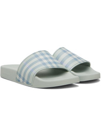 Rubber slides. · Open toe · Check pattern at vamp · Logo embossed at molded footbed · Treaded rubber sole Supplier color: Seafoam green Upper: rubber. Sole: rubber. Made in Italy 261376F124007