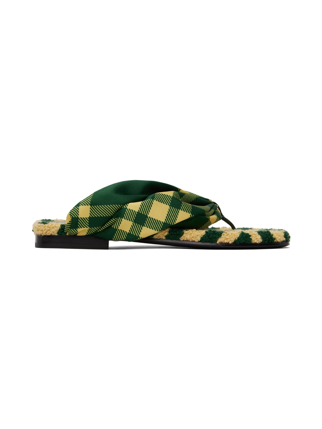 Satin slip-on sandals in green and yellow. · Gathering and check pattern printed throughout · Thong-style strap · Sheepskin logo patch at terrycloth footbed · Stacked leather heel · Leather sole Supplier color: Primrose IP check Upper: textile, sheepskin. Sole: leather. Made in Italy 241376F124008