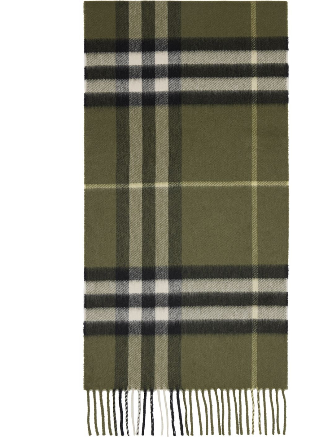 Rectangular cashmere flannel scarf. · Check pattern throughout · Fringed detailing at ends · L66" x W11.75" Supplier color: Pea 100% cashmere. Made in United Kingdom 252376F028041