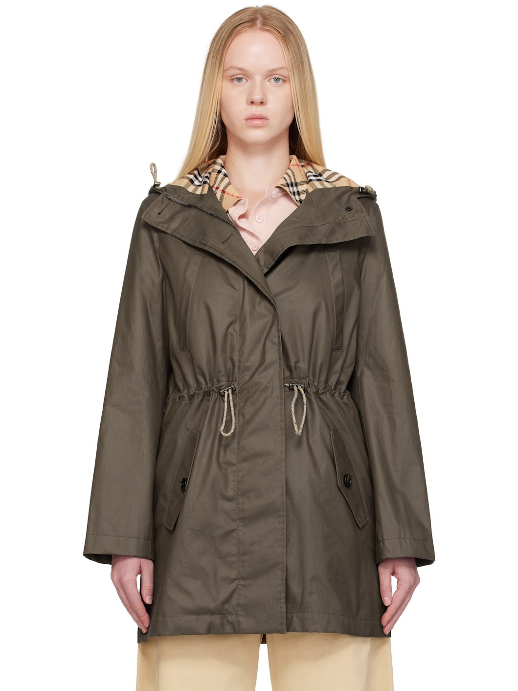 Lightweight coated cotton gabardine parka. · Bungee-style drawstring at hood and waist · Stand collar · Zip closure with button placket · Welt pockets at chest · Flap pockets at waist · Fully lined Supplier color: Military Body: 100% cotton. Lining: 100% cotton. Made in United Kingdom 252376F063002