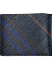 Coated cotton-blend canvas bifold wallet. · Jacquard check pattern throughout · Six card slots · Two patch pockets · One note slot · Buffed lambskin and faux-leather lining · H3.5" x W4.25" Supplier color: Midnight Body: 69% cotton, 21% viscose, 10% linen. Lining 1: 100% lambskin. Lining 2: 53% cotton, 47% polyurethane. Made in Italy 252376M164010