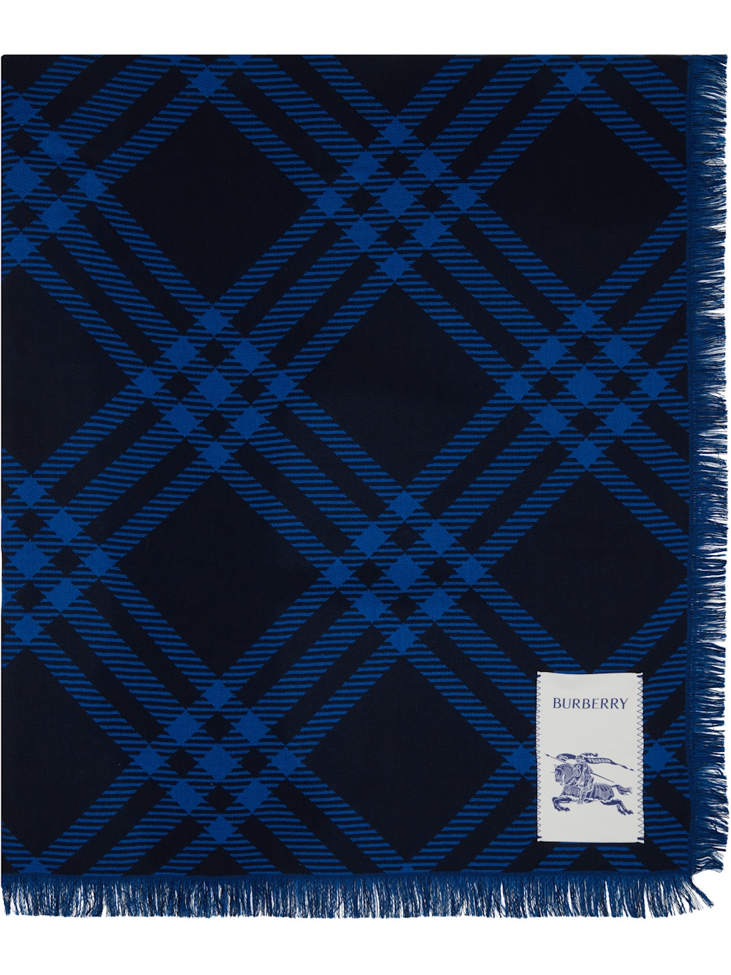 Rectangular wool- and silk-blend flannel scarf. · Check pattern throughout · Logo patch at face · Fringed detailing at edges · L78.75" x W25.5" Supplier color: Ink/Blue 70% wool, 30% silk. Made in Italy 252376M150009