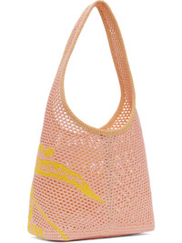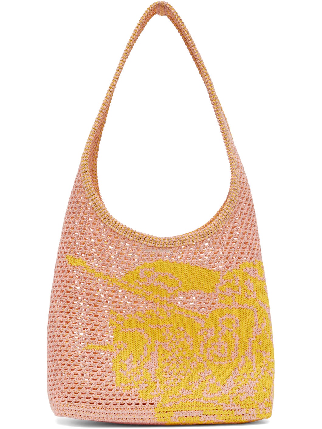Open-knit tote in pink and yellow. · Jacquard logo graphic throughout · Fixed shoulder strap · Open throat · H8.5" x W10.5" x D5.5" Supplier color: Pink/Yellow Textile. Made in Italy 252376F049001