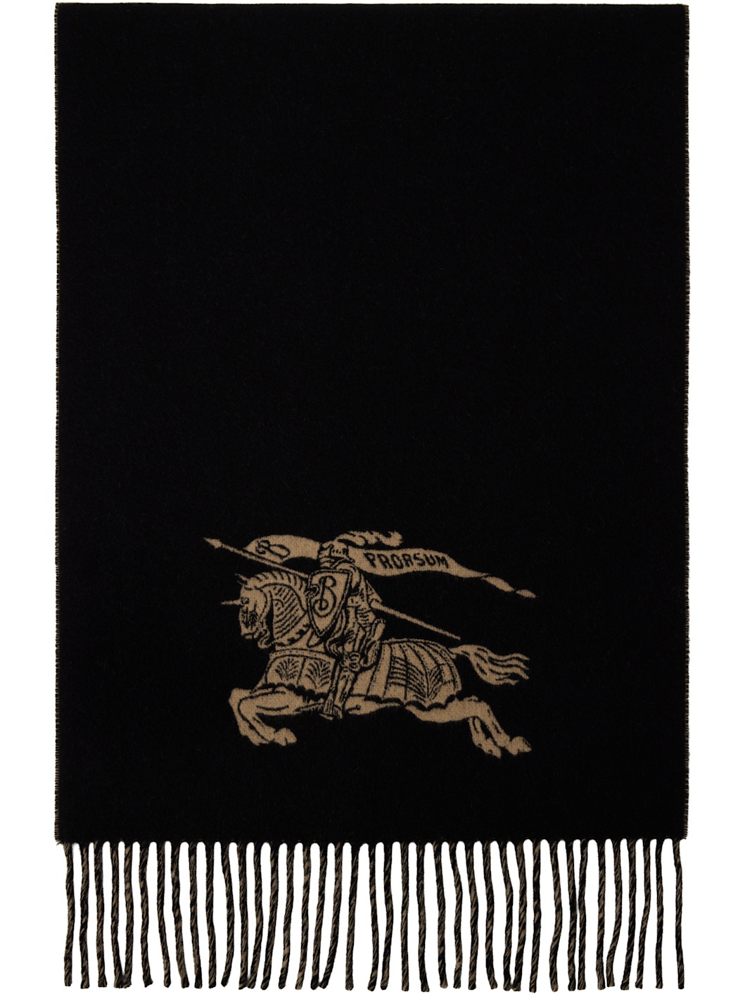 Rectangular cashmere flannel scarf in tan and black. · Jacquard logo at face · Jacquard logo graphic at back face · Fringed detailing at ends · L82.75" x W17.75" Supplier color: Camel/Black 100% cashmere. Made in Italy 252376F028014