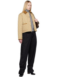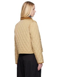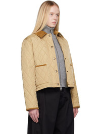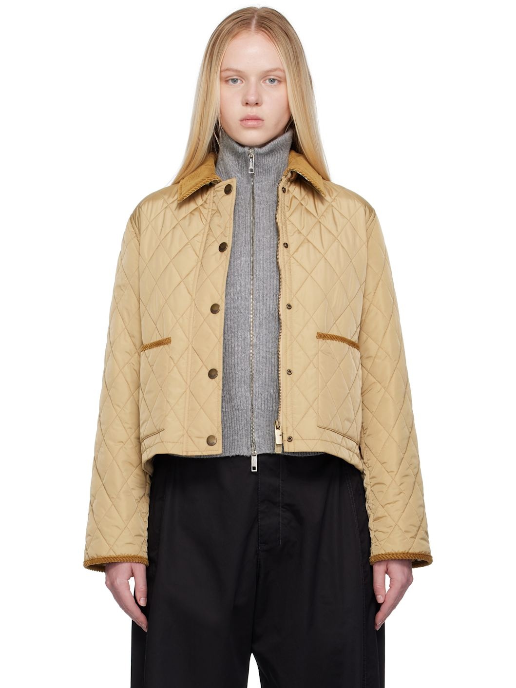 Nylon technical satin jacket. · Insulated and quilted · Corduroy spread collar · Two-way zip closure with press-stud placket · Patch pockets at waist · Corduroy trim at pockets and cuffs · Logo flag at side seam · Check-patterned cotton twill lining · Antiqued gold-tone hardware Supplier color: Flax/Sand check Body: 100% nylon. Fill: 100% polyester. Lining: 100% cotton. Made in Thailand 252376F063016