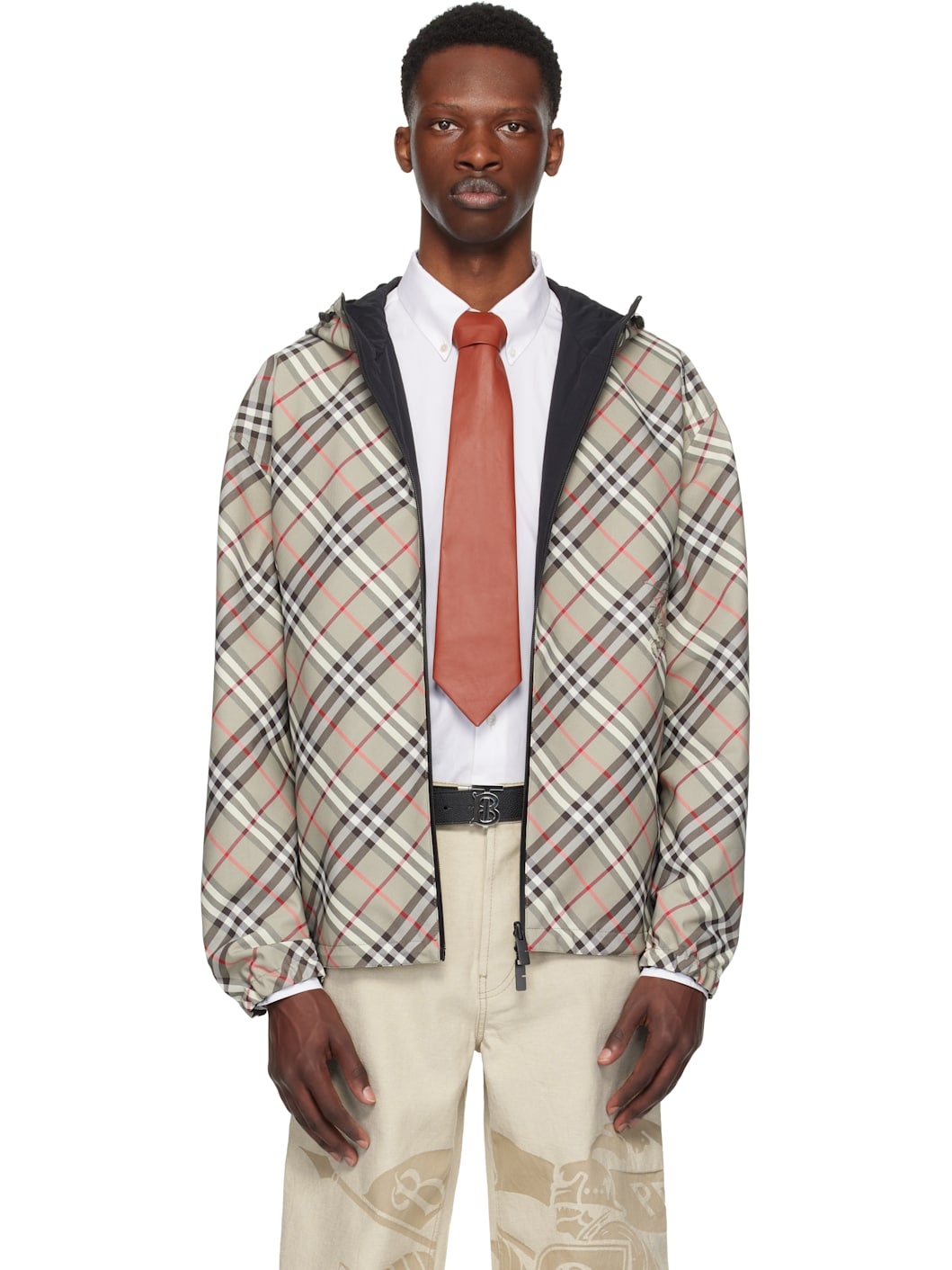 Reversible water-resistant polyester twill jacket. Check pattern throughout. Reverse in black crinkled nylon taffeta. · Bungee-style drawstring at hood · Two-way zip closure · Logo graphic applique at front · Zip pockets · Bungee-style drawstring at hem · Elasticized cuffs · Welt pockets at interior Supplier color: Mauve grey Body: 100% polyester. Lining: 100% nylon. Made in Romania 252376M180011