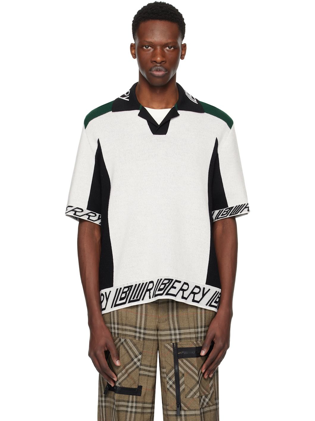 Lightweight knit wool polo. · Jacquard logo at spread collar, hem, and cuffs · Open placket · Rib-knit hem and cuffs Supplier color: White/Black/Green Body: 100% wool. Trim: 89% wool, 10% polyamide, 1% elastane. Made in Italy 252376M212004