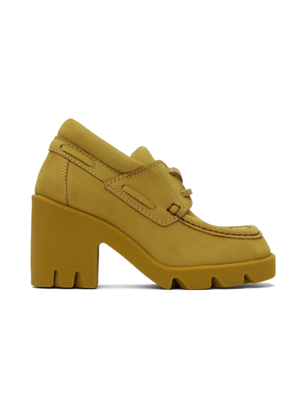 Nubuck leather heels in yellow. · Square moc toe · Rubberized logo tag at lace-up closure · Padded tongue and collar · Mesh lining · Textured rubber block heel · Lugged rubber sole · Heel: H3.5" Supplier color: Manilla Upper: leather. Sole: rubber. Made in Italy 232376F122010