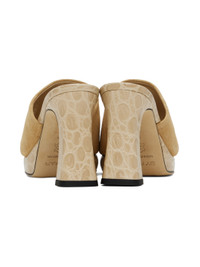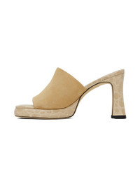 Croc-embossed leather slip-on heeled sandals in beige. · Open square toe · Suede strap at vamp · Logo embossed at padded leather footbed · Covered platform midsole · Covered block heel with rubber injection · Leather sole · Platform: H0.75 in · Heel: H3.75 in Supplier color: Kraft