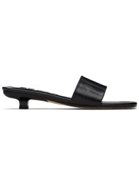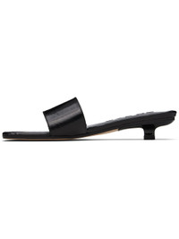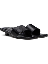 Eel-embossed leather heeled sandals in black. · Open square toe · Logo embossed at molded footbed · Covered kitten heel with rubber injection · Nubuck sole · Heel: H1.25" Supplier color: Black Leather. Made in Bulgaria 251289F125004