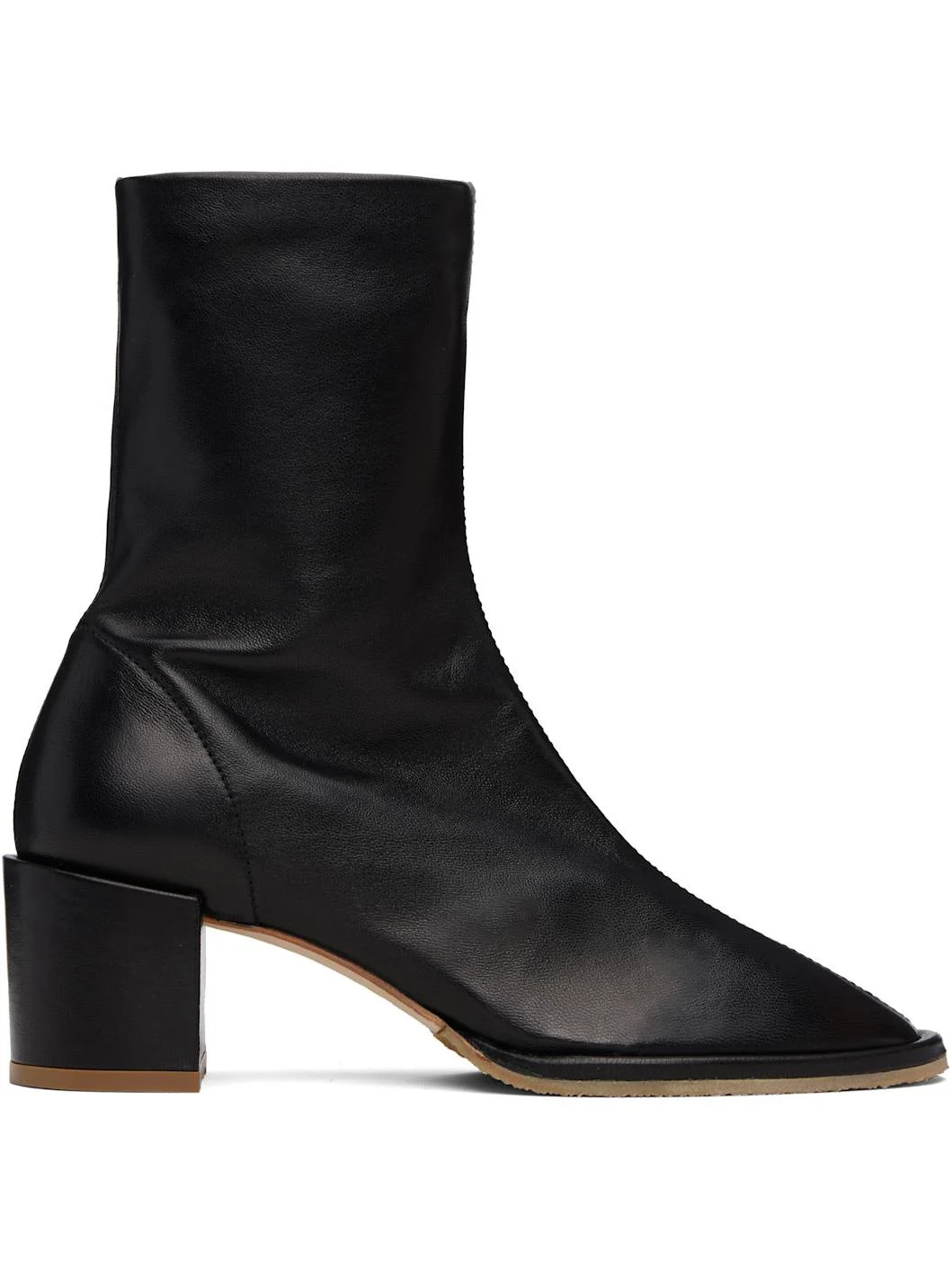 Ankle-high grained nappa lambskin boots. · Central seam at vamp · Zip closure at inner side · Suede lining · Covered block heel with rubber injection · Nubuck and crepe-rubber sole · Heel: H2.25" Supplier color: Black Upper: lambskin. Sole: rubber, leather. Made in Bulgaria 252289F113002
