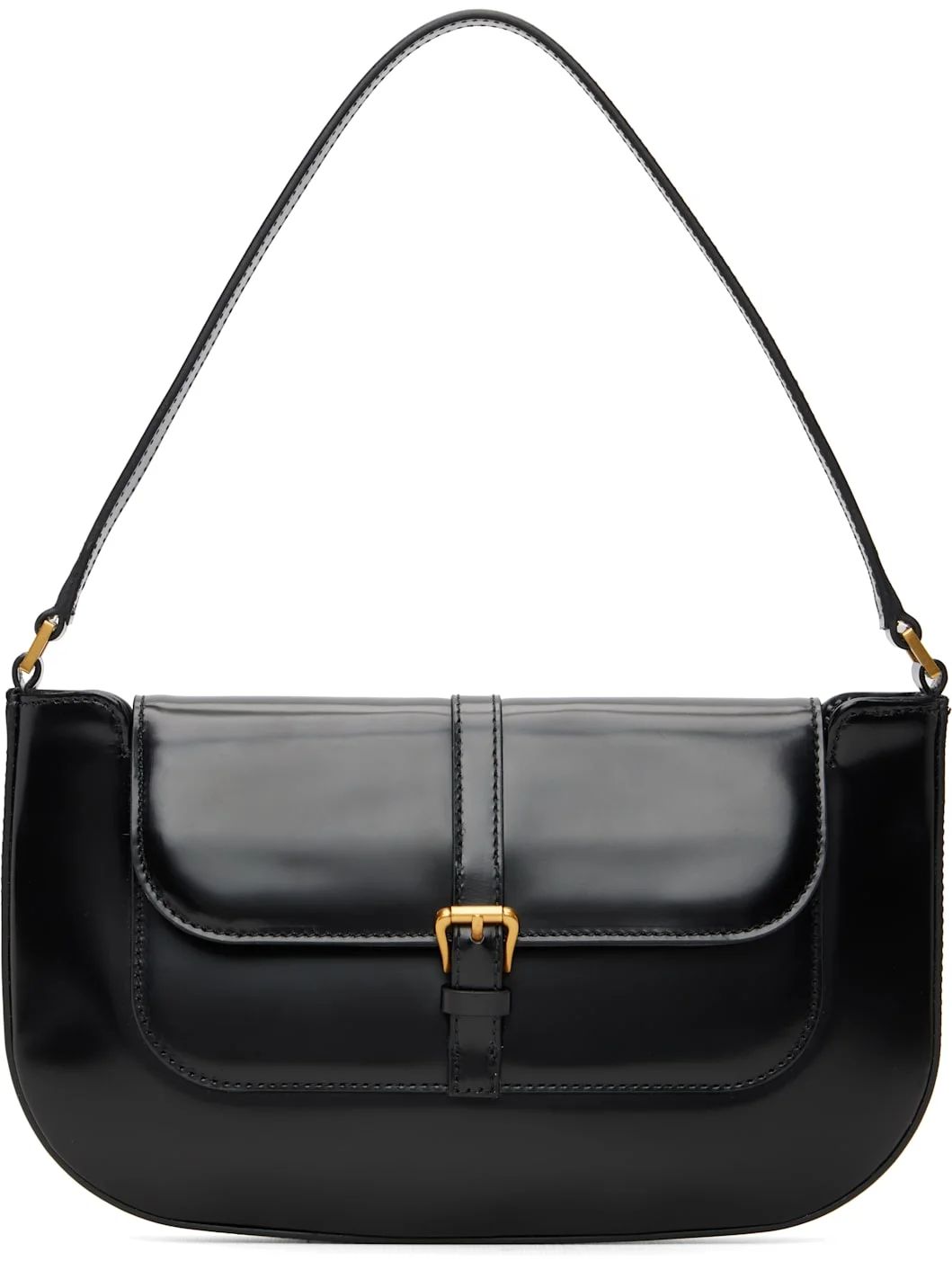 Patent leather shoulder bag. · LWG-certified leather · Fixed shoulder strap · Pin-buckle hardware at magnetic press-stud flap · Patch pocket at interior · Cotton twill lining · H6" x W10.75" x D1" Supplier color: Black Leather. Made in Bulgaria 261289F048011