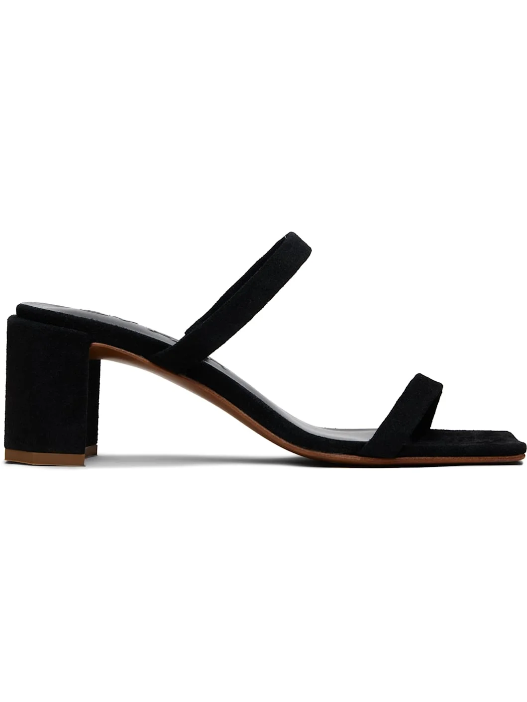 Suede heeled sandals. · Open square toe · Fixed straps at vamp · Block heel with rubber injection · Leather sole · Heel: H2.5" Supplier color: Black Leather. Made in Bulgaria 261289F125010