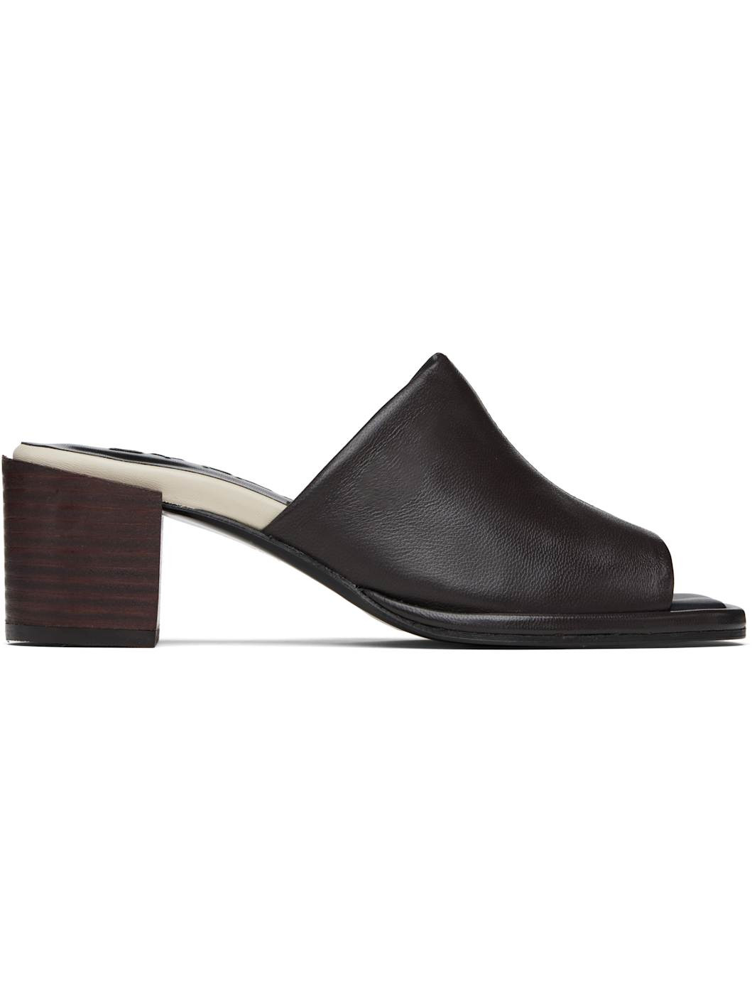 Grained nappa lambskin heeled sandals. · Open square toe · Central seam at vamp · Logo embossed at padded leather footbed · Stacked block heel with rubber injection · Polished leather sole · Heel: H2" Supplier color: Ristretto/Limewash Upper: lambskin. Sole: leather, rubber. Made in Bulgaria 252289F122005