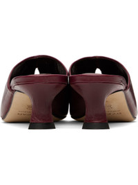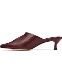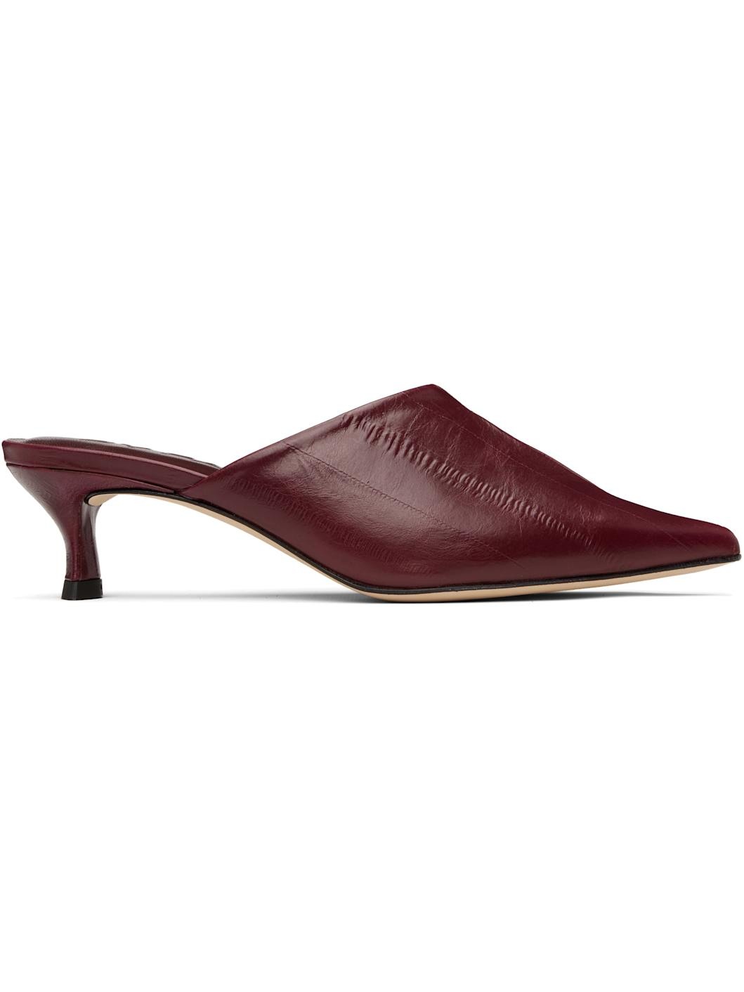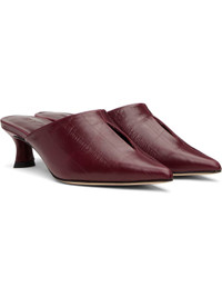 Eel-embossed lambskin mules in burgundy. · Pointed toe · Cutout at vamp · Covered kitten heel with rubber injection · Logo embossed at footbed · Nubuck sole · Heel: H2.25" Supplier color: Sour cherry Upper: lambskin. Sole: leather. Made in Bulgaria 251289F125007