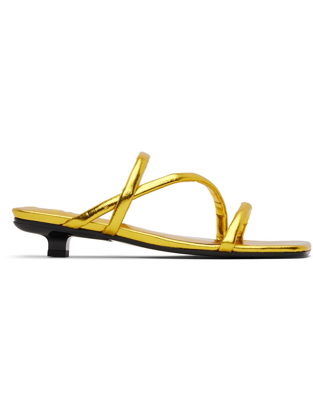 Eel-embossed leather heeled sandals in metallic gold tone. · Open square toe · Padded and partially elasticized straps at vamp · Logo embossed at molded footbed · Covered kitten heel with rubber injection · Polished leather sole · Heel: H1.25" Supplier color: Yellow gold Leather. Made in Bulgaria 251289F125012