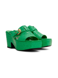 Croc-embossed leather slip-on heeled sandals in green. · Open square toe · Adjustable pin-buckle strap at vamp · Logo embossed at padded leather footbed · Covered block heel and platform midsole · Rubber sole · Platform: H1.75 in · Heel: H3.5 in Supplier color: Super green Upper: leather. Sole: rubber. Made in Portugal 221289F125047