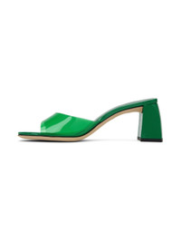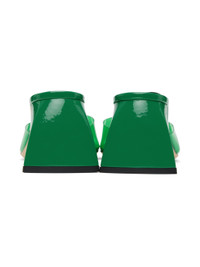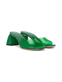 Oeko-Tex®-certified PVC and patent leather heeled sandals in green. · Open square toe · Logo embossed at padded leather footbed · Covered block heel with rubber injection · Leather outsole · Heel: H2.75 in Supplier color: Clover green Upper: leather, polyvinyl chloride. Sole: leather. Made in Portugal 231289F125065