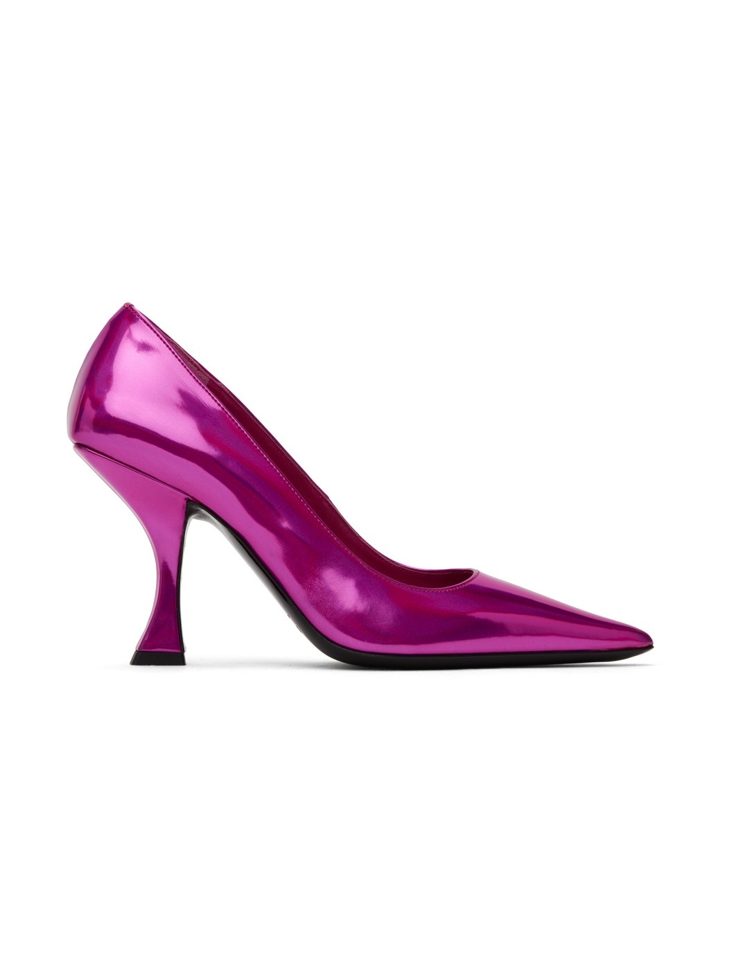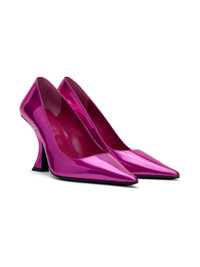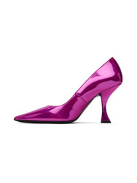 Patent faux-leather heels in pink. · Pointed toe · Logo embossed at padded leather footbed · Grained goatskin lining · Covered stiletto heel with rubber injection · Leather outsole · Heel: H3.5 in Available exclusively at SSENSE. Supplier color: Fuchsia Upper: synthetic. Sole: leather, rubber. Made in Portugal 232289F122016