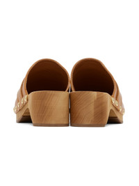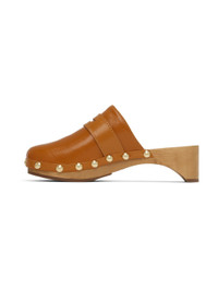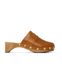 Grained lambskin slip-on loafers in tan. · Leather strap with cutout at vamp · Logo engraved at footbed · Stud hardware at welt · Wood block heel and midsole · Rubber outsole · Heel: H2 in Supplier color: Caramel Upper: lambskin, wood. Sole: rubber. Made in Portugal 221289F121009