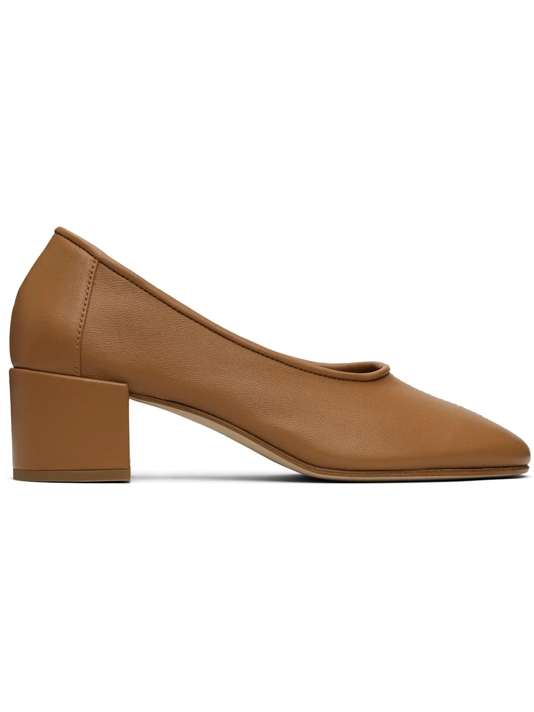 Buffed nappa leather heels. · Central seam at vamp · Suede lining · Block heel with rubber injection · Nubuck sole · Heel: H1.75" Supplier color: Summer Tan Leather. Made in Bulgaria 261289F122004