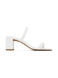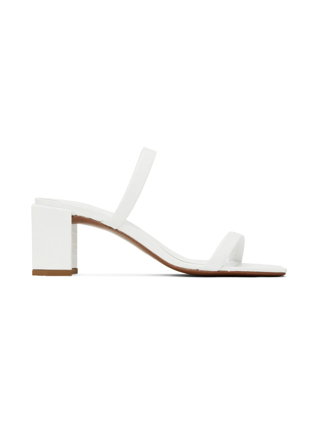 Lizard-embossed leather slip-on heeled sandals in white. · Open square toe · Partially elasticized strap at vamp · Covered block heel with rubber injection · Leather outsole · Heel: H2.5 in Supplier color: White