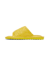 Padded croc-embossed leather slip-on sandals in yellow. · Open round toe · Logo hardware at vamp · Logo embossed at padded leather footbed · Treaded EVA foam rubber outsole Supplier color: Duckling Upper: leather. Sole: rubber. Made in Portugal 231289F124007