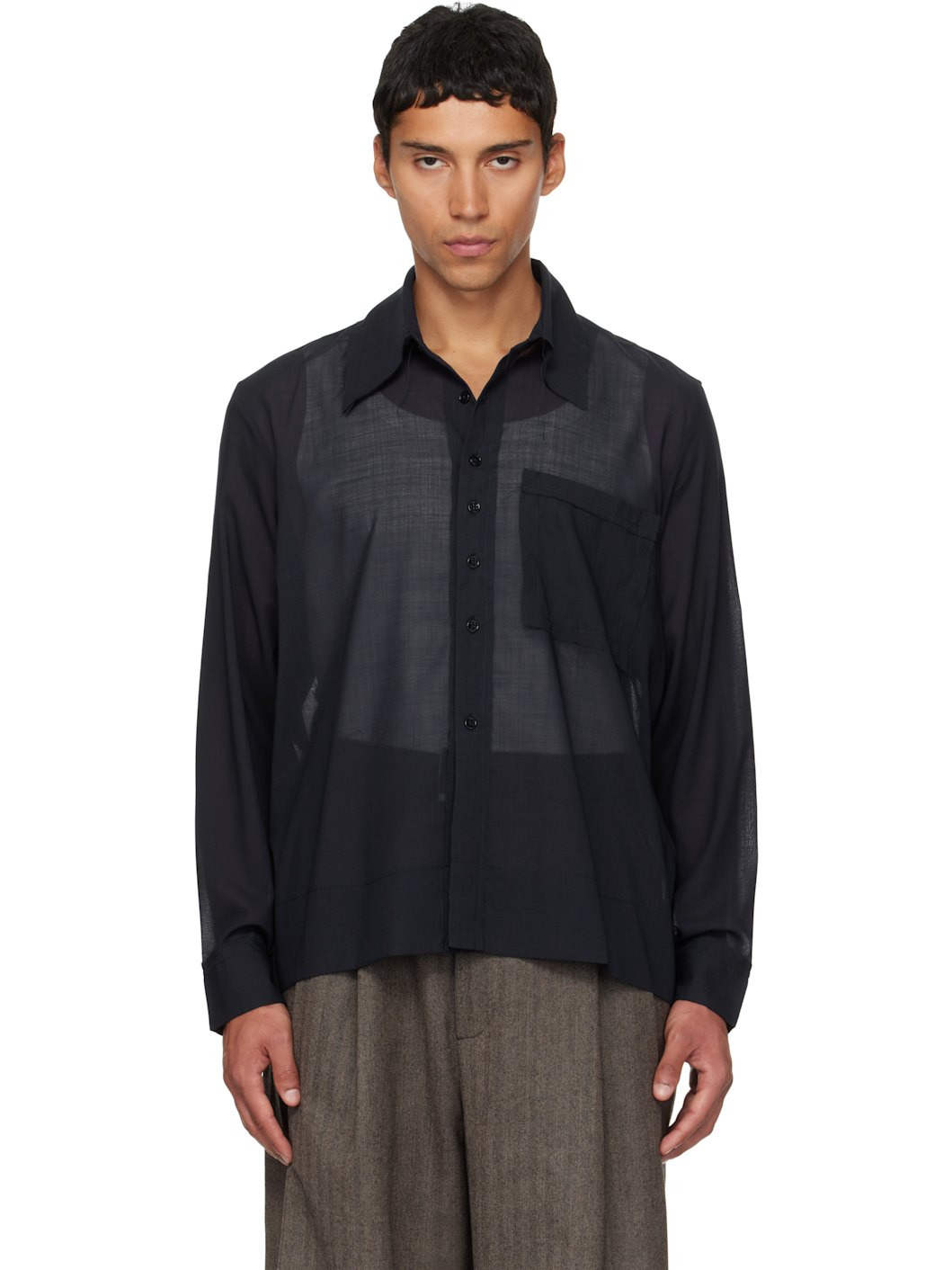 Semi-sheer plain-woven wool-blend shirt. · Raw edges throughout · Pointed collar · Button closure · Patch pocket at chest · Topstitching at back collar · Mother-of-pearl hardware Supplier color: Navy 74% wool, 26% polyamide. Made in Portugal 252109M192002